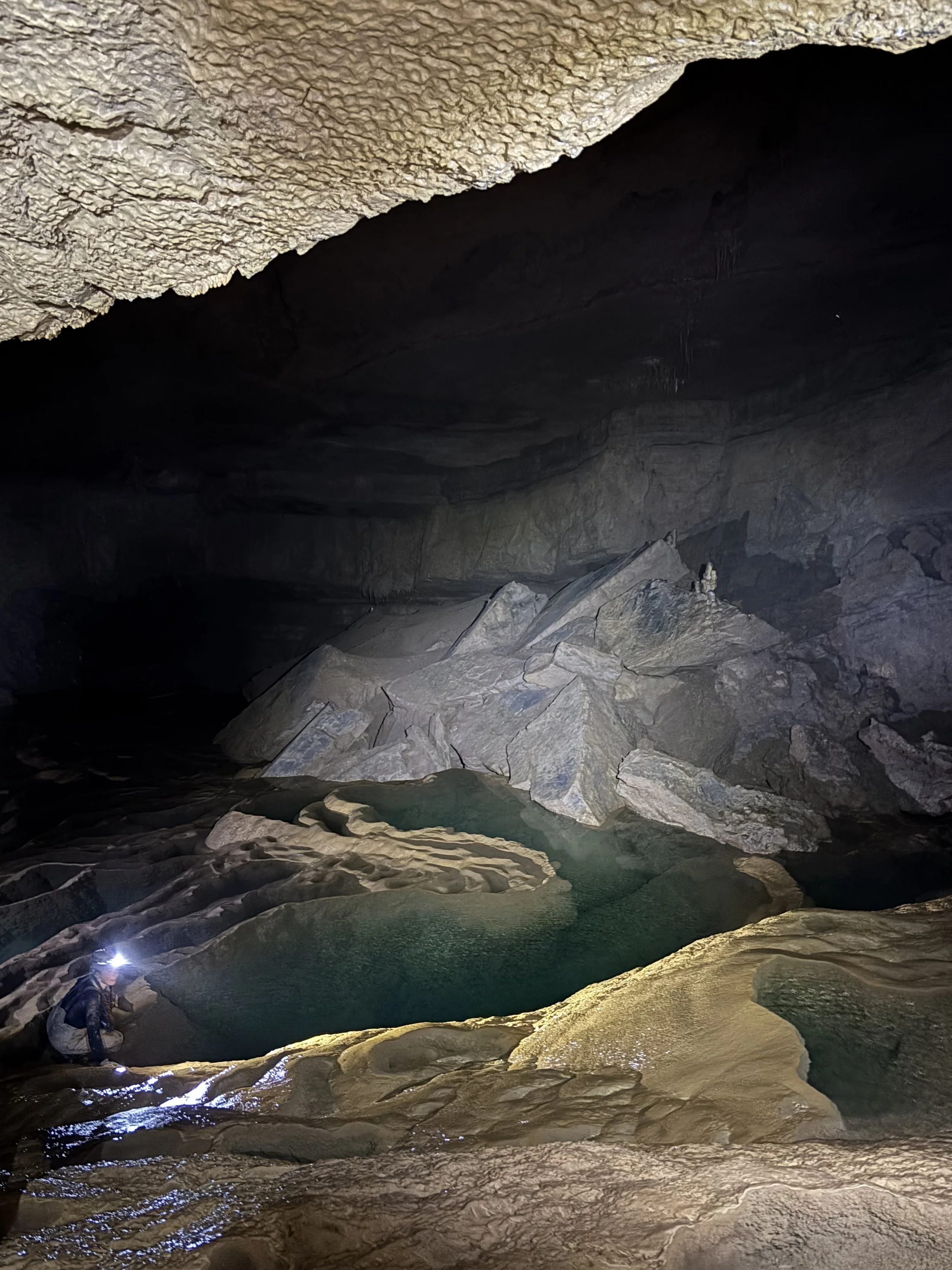 As we pulled in there were cows and calves in the field which was a nice welcome. We chatted with the landowner and met his dogs before gearing up and heading into Piercy Mill. Josh and Will got distracted on the walk to the cave entrance and poked around another opening to see if it went anywhere. When they made it to the group we all slid down the banks and right into the very cold, and waist deep water. We entered the cave at 11:45am. The water was a good few inches higher than last year and had a current so it was a fun adventure getting in and out of the water and up the muddy banks. We headed back towards the rimstone pools and after a climb up a rock/ dirt scramble we could see down into the first room. Each pool was full to the brim and flowing down into the ones below it. We moved through the first room and into the second, bigger room. We saw a crawfish! This was a great time to do some exploring and take some great photos. Josh and Margo adventured down a crawl while Eric and Chris climbed up and explored a different passage. The rest of us took photos and admired the deep blue pools. After a while we were all getting chilly so we headed back towards the entrance making a few more stops. Tristen, Josh, and maybe Will or Erik (I don’t remember, I was down a different passage) crawled down a passage to see where it went while Maya, Margo, and I crawled through a dry passage with lots of old signatures.